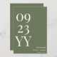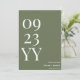 Mit dem Big Bold Date Sage Green Save the Date ein bleibender Eindruck machen. Dieses minimalistische Design mit einem beruhigenden, grünen Hintergrund mit fett weißen Buchstaben und Zahlen unterstreicht Ihren Hochzeitstag neben dem Bräutigam und den Brauennamen. Diese Karte, die sich perfekt für moderne, rustikale oder naturlich inspirierte Hochzeiten eignet, verbindet Einfachheit mit Eleganz und sorgt dafür, dass Ihre Gäste sich freuen, ihre Kalender für Ihren besonderen Tag zu markieren.
