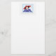 Eine Dame, die einen roten Hut mit einem großen weißen Disy trägt, trägt auch ein lila Kleid.
