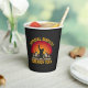 Bigfoot sieht glücklich aus, wenn er weitergeht. Es handelt sich um ein Retro-Sonnenaufgang in Gelb, Orange und Rot und sieht auf einem schwarzen oder dunklen Hintergrund hervorragend aus.
