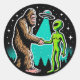 Dieses skurrile Bild illustriert eine freundliche Begegnung zwischen zwei legendären Wesen: Bigfoot und einer Alien. Die Szene, Set gegen einen Sternenhimmel mit Silhouetten von Kiefernbäumen, zeigt Bigfoot und die Alien, die Hände schüttelt unter dem Balken eines Ufo, der sich über. Bigfoot, mit braunem Fell bedeckt, steht auf dem links, während die grüne, humanoide Alien mit einem großen Kopf und schwarze Augen auf der rechten Seite steht. Die Kombination dieser ikonischen Figuren in einem friedlichen Treffen fügt beiden Mythen eine spielerische Drehung hinzu und macht sie zu einem faszinierenden und humorvollen Stück für die Enthusiasten des Unerklärten.