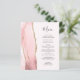 Die links Seite dieses eleganten, modernen Hochzeitsmenüs besticht durch eine rosa Aquarellwand in Rosa, die mit vergoldetem Imitat-Glitzer besticht. Der anpassbare Text kombiniert handgeschriebene handgeschriebene handgeschriebene Schriftzeichen aus Holzkohle und kopperplate-Schriftart auf einem rot-rosa Hintergrund. Auf der Rückseite ist ein passendes Rose- und Gold-Agate-Design zu sehen.