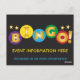 Bingo Event Postkarte können Sie für Bingo Night, regulären Bingo Game Day, oder spezielle Event Spendenaktion anpassen. Die Buchstaben für BINGO sind in metallischem Gold auf farbigen Kreisen mit Sternen oben auf schwarzem Hintergrund. Bearbeiten Sie die Textzeilen mit Informationen über Ihr Ereignis, fügen Sie Text auf der Rückseite oder schreiben Sie eine persönliche Note.