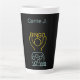 Personalisierte latte Tasse für Bingofreunde, mit neongelben und blauen Bingo Night Line-Grafiken auf schwarzem Hintergrund.