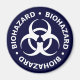 Dunkelblauer Magnet mit weißem Biogefährdung-Symbol und Warntext.