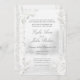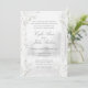 Eine weiche, weiße Birkenwaldhochzeit mit einem nebeligen Waldhintergrund mit reinen weißen Birkenbäumen im Vordergrund, die mit weißen Pfannenbäumen und silbernen Eukalyptuspflanzen geschmückt sind. Die Eltern von Bride und Groom laden die Gäste mit ihren Namen in einer klassisch modernisierten Hochzeitsschrift ein. Die Rückseite der Einladung sieht eher wie das Cover aus und zeigt die Nachnamen von Braut und Groom.