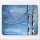Das Bild zeigt das traditionelle Gemälde von Dawn K. Williams "Tranquil Lake", eine blaue und grüne Landschaft mit Birken- und Pinienbäumen, sanften Hügeln und einem reflektierenden See.