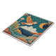 Ceramic tile art featuring a bird in flight, with orange and white plumage, set against a teal sky dotted with white stars. A yellow moon with floral accents and a dark blue crescent is visible in the upper right corner. Below, a landscape with a body of water, white clouds, and orange-toned land formations is depicted. The foreground includes stylized plants and flowers in shades of green, white, and orange.