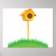 Dieses Design ist ein Vogelhaus. Das Vogelhaus befindet sich auf einem Pfosten inmitten eines grünen Graspflasters. Dieses Vogelhaus-Design sieht toll aus auf diesem Poster