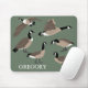 Erstellen Sie ein personalisiertes Geschenk, das sich perfekt für Vogelliebhaber eignet. Dieses benutzerdefinierte Mauspad hat realistische Stilbeispiele für kanadische Gänse in braunem, weißem und schwarzem Set vor einem schlauen grünen Hintergrund. Unter der Grafik ist ein Platz, um einen Namen in weißen Buchstaben hinzuzufügen.