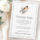 Elegant funeral thank you card featuring a watercolor painting of a little bird perched on a branch, and your custom message surrounded by a thin border.