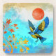 Dieses wunderschöne Design zeigt einen blauen und goldenen Vogel, der eine Landung auf einem goldenen Baum mit einem schönen Himmel mit vielen blauen Farben und einer kühlen orangen Sonne.