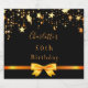 Elegantes, klassisches, glamouröses und mädchenhaftes Geburtstagslabel. Imitate goldfarbenes Band und Bugs mit goldenen Sternen tropfen. Schwarzer Hintergrund. Mit dem Text: 50. (oder jedes Alter) Geburtstag. Personalisieren und fügen Sie einen Namen, der mit einem modernen handgeschriebenen Stil geschrieben wurde.