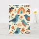 This card features a folk-style pattern of stylized birds in teal, deep blue, and warm rust-orange, scattered across a soft creamy background 🐇. Their speckled chests, sweet eyes, and tiny lash details give them a gentle, friendly look, like they’re quietly keeping each other company. Between them sit bright orange five-petaled flowers with muted blue-green leaves, adding little sparks of springtime warmth 🌷. Curved arc shapes appear here and there like small rainbows, creating a tender, uplifting rhythm across the scene. Small dot clusters sprinkled around the birds add a confetti-like texture without crowding the layout. The words “HAPPY EASTER” sit prominently near the center in rounded orange lettering, standing out clearly against the pale backdrop. The birds and flowers are evenly spaced so the message feels surrounded by friendly faces and soft blooms. A few arcs curve above and beside the lettering while orange flowers and dotted accents fill the open spaces nearby.
