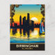 Sonnenuntergang auf den Gebäude von Birmingham, Alabama. Segelboot auf dem Wasser. Illustriertes Vintage Reiseplakat.