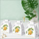 Ganze goldene Birnen, die inmitten grüner Blätter mit weißen Blüten hängen.