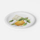 Ganze goldene Birnen, die inmitten grüner Blätter mit weißen Blüten hängen.