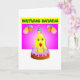 Eine Cartoon-Banane, die die Kerzen auf seinem Geburtstagskuchen ausbläst. Illustration auf verschiedenen Geschenken und Produkten verfügbar.