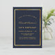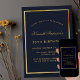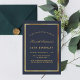 Ein dunkelblauer Hintergrund, ein mit einem vergoldeten Rahmen aus Imitaten geschmückter Raum. Personalisieren und fügen Sie einen Namen und Party-Details hinzu. Der Name wird mit einem eleganten, handgeschriebenen Stilskript geschrieben. Zurück: blauer Hintergrund.