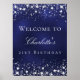Ein Begrüßungspposter für eine glamouröse 21. Geburtstagsfeier (oder jedes Alter). Ein marineblauer Hintergrund mit eleganten Imitaten, die silberne Sterne tragen. Die blaue Farbe ist ungleichmäßig. Personalisieren und fügen Sie einen Namen und Alter 21. Weiße Buchstaben.