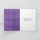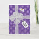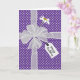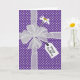 Weißer, schlichter Bogen mit weißer Blende und Geschenktafel auf weißem und lila Polka Dotmuster. Glücklicher Geburtstagstext ist bearbeitbar.