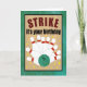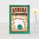 Dies ist eine Geburtstagskarte für alle, die Bowling Lieben. Es gibt zehn Buttone, die mit einer Kegelkugel aus grünem Marmor geschlagen werden. Im Text steht: "Strike - es ist dein Geburtstag."