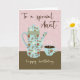 This is a birthday card for an Aunt with a blue coffee pot and cup decorated in folkart influenced flowers, birds and bees. The background is a soft pink designed wallpaper and brown table with the text ‘To a Special Aunt, Happy Birthday.’