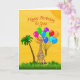 A bright and cheery birthday card for anyone with a yellow background and a giraffe holding a bunch of balloons and the words above "Happy Birthday to you".