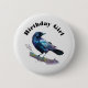 Button mit einer schönen Wasserfarbe zeichnend von einer Krähe. Dunkelblau und lebendige lila Farbtöne unterstreichen die Schönheit dieses Vogels. Im Text steht: "Birthday Girl" , kann man ändern, um zu sagen, was man will.