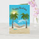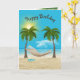 Hängematte zwischen zwei Palmen mit Seestern und Flip-Flops am Strand Sand mit Sommerwolken. Text kann bearbeitet werden.