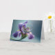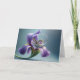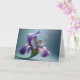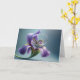 Ein kleiner Kolibri badet in einer Glasschüssel und steht zum Geburtstag in einer lebendigen lila Iris-Blume. Text kann geändert werden.