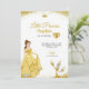 Birthday invitation featuring a princess in a yellow gown and a candelabra character. Text reads, "Little Princess Sophia is turning five," with elegant gold accents.