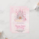 Birthday invitation with a pink castle, surrounded by birds and a unicorn, set on a soft pink background. Text invites to "Princess Arletta’s 8th birthday."