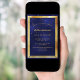 Eine trendige, moderne 50. Geburtstagskarte für Männer, Typ und Männer. Ein dunkelblauer, marineblauer Hintergrund. Die blaue Farbe ist ungleichmäßig. Mit einem goldenen Rahmen und goldenen Konfetti-Imitat sprinkle, goldfarbene Buchstaben. Vorlagen für Ihre Party-Informationen. Zurück: blauer Hintergrund mit Konfetti sprinkle.