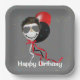 Das lächelnde Gesicht des Menschen mit Haar- und Luftsonnenbrille auf Party-Ballons und Konfetti für eine Geburtstagsparty. Die Farbe des grauen Hintergrunds kann geändert werden. Text ist bearbeitbar.