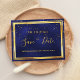 Eine Save the Date Karte für eine 50. Geburtstagsparty (oder jedes Alter) für einen Typ, Mann, Mann. Ein dunkelblauer Hintergrund mit goldenen Konfetti und einem goldfarbenen und schwarzen Rahmen in den Imitaten. Die blaue Farbe ist ungleichmäßig. Vorlagen für Datum und Name/Alter 50. Goldene Buchstaben. Der Text: Save the Date ist mit einem großen angesagten, handgeschriebenen Stilskript geschrieben. Zurück: schlichtes Postkartendesign.