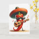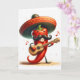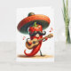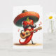 Ein fröhlicher anthropomorpher, roter Chili Pfeffer mit einem großen Sombrero und schwarzem Schnurrbart beim Schlagen einer Gitarre. Text kann geändert werden.