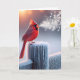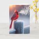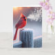 Ein schöner Roter Kardinal auf einem frostigen Zaunpfosten mit sanften Noten in der Wintermorgendluft. Text ist bearbeitbar.