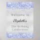 Ein Willkommensgruß für eine mädchenhafte und glamouröse Geburtstagsfeier (oder jedes Alter). Ein Imitat silber aussehender Hintergrund mit blauen Imitaten Glitzer. Personalisieren und fügen Sie einen Namen und Alter. Schwarze Buchstaben.