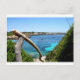 Ein wunderschöner landschaftlicher Ausblick auf den Hügel, bevor Sie zum malerischen Strand von Menorca, Spanien, laufen. Das ist eine der Balearen. Klar blaues Wasser, grüne Blätter und sonniger Himmel!