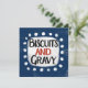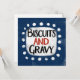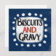 Un design alimentaire sud amusant et mignon typographique qui dit "Biscuits et Gravy". Il a du texte noir et rouge sur un rectangle blanc avec des points blancs amusants autour, le tout sur un arrière - plan bleu.