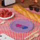 Teller mit Herz in Bisexualität, Stolz-Fahne, Bi-Stolz-Design auf lila Hintergrund; Rosa oder Magenta, lila und blaue Herzen