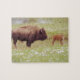 In diesem digitalen Gemälde, das auf einem Originalfoto des Künstlers/Fotografen Jayne Wilson basiert, stehen Bison und ihr Kalb auf einer Wiese des Yellowstone Nationalparks.