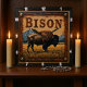 Diese Abbildung zeigt einen dunklen, bemalten Lederhintergrund mit einem majestätischen Bison oder Büffel in einem Feld. Hinter dem Gebirge ist eine Bergkette zu sehen, die im warmen, erdigen Glühen eines Sonnenuntergangs badet. Der untere Teil des Bildes enthält den Text "BISON".