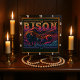 Diese Abbildung zeigt einen mächtigen Bison oder Büffel in einem Feld, Set vor einem Hintergrund einer Gebirgskette bei Sonnenuntergang. Das gesamte Kunstwerk hat eine charakteristische, bedruckte Lederstruktur mit lebhaften Neonfarben im Himmel und einem dunklen, rustikalen Vordergrund. Die Worte "BISON, ganz oben.