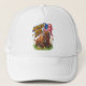 Amerikanisches Buffalo Bison im orangen und schwarzen Text. Ein amerikanischer Bison-Büffel auf Gras weidet mit der amerikanischen Fahne im Hintergrund.