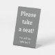 Dieses angesehene Design enthält die Meldung "Bitte nehmen Sie Platz!", zusammen mit der Meldung "Wir werden gleich zurück sein". Dies könnte in einem Sitzbereich genutzt werden, um Kunden oder Besuchern zu informieren, dass sie in Kürze unterstützt werden und bis dahin einen Platz einnehmen sollten.