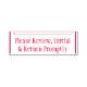 Diese Briefmarke beinhaltet die Nachricht "Bitte überprüfen, Initial & Return Schnell" sowie eine Zeile, in der eine Signatur oder Initialen geschrieben werden können. Es könnte von einem Erzieher oder einem administrativen berufliche verwendet werden, um zu verlangen, dass jemand den Inhalt eines Dokuments überprüft und anerkennt.