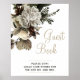 Elegante, weiße Elfenbein-Winterbäume mit saisonalen Grünflächen, Blattwerk und handgeschriebenem, trendigem Kalligrafieschrift, das ein schicke Hochzeitszeichen macht, das Ihre Gäste einlädt, ihre Gedanken in Ihrem Gästebuch verlassen. +++++++++++++ Für verwandte Hochzeitsartikel lesen Sie bitte die gesamte Sammlung unter dem Hauptbild.