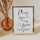 Bitte unterschreiben Sie unser Rahmen Hochzeitszeichen mit modernem Kalligrafieschrift mit Herzakzenten und einer einfachen Gästebuchungsanfrage für Ihre Hochzeitsgäste. Die Farben Schwarz und Weiß können geändert werden.