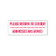 Dieses einfache Design aus Gummi-Briefmarke beinhaltet die Botschaften "BITTE RÜCKKEHR ZUM SENDER!" und "ADDRESSEE HAT SICH BEWEGT". Es kann verwendet werden, um anzugeben, dass die erhaltene Briefpost an die falsche Adresse geliefert wurde oder der Empfänger unbekannt ist, und an den Absender zurückzusenden.